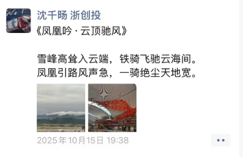 那是沈千旸第一次与张雪见面时,在江北机场写就的。1996年出生的“摩托佬”在这首名为《凤凰吟•云顶驰风》的古体诗里这样写道:雪峰高耸入云端,铁骑飞驰云海间。凤凰引路风声急,一骑绝尘天地宽。
