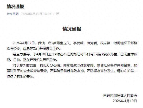 近日,广西百色市田阳区一名5岁男童走失,引发网友关注。19日下午,田阳区那坡镇政府发布情况通报称,该儿童于19日上午被找到,已无生命体征。
